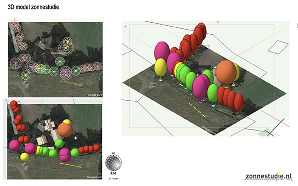De bomen zijn als gestileerde volumes gemodelleerd met als referentie de hoogte en kruindiameter die door opdrachtgever zijn opgemeten en doorgegeven. Om een compleet beeld te krijgen van de schaduwbeweging gedurende het hele jaar zijn als data 21 maart (vergelijkbaar met 21 september), 21 juni (de langste dag met de zon in de hoogste positie) en 21 december (de kortste dag met de zon in de laagste positie) gekozen voor de visualisaties.