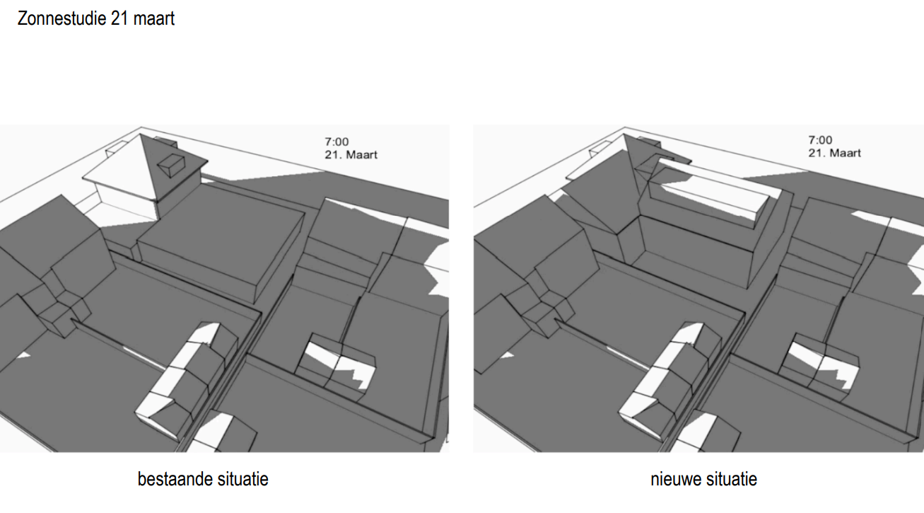 Op de achtergevel van buur 1 valt extra schaduw tussen 07:30u en 12:00u. Op de achtergevel van buur 2 valt geen extra schaduw. Op de achtergevel van buur 3 valt geen extra schaduw. Op de achtergevel van buur 4 valt extra schaduw tussen 15:30u en 20:30u. NB De mate van extra schaduw is relatief beperkt tot maximaal ca 25% van de betreffende achtergevels. Tussen de genoemde tijdstippen valt er nog steeds zonlicht op betreffende achtergevels.